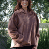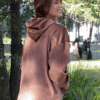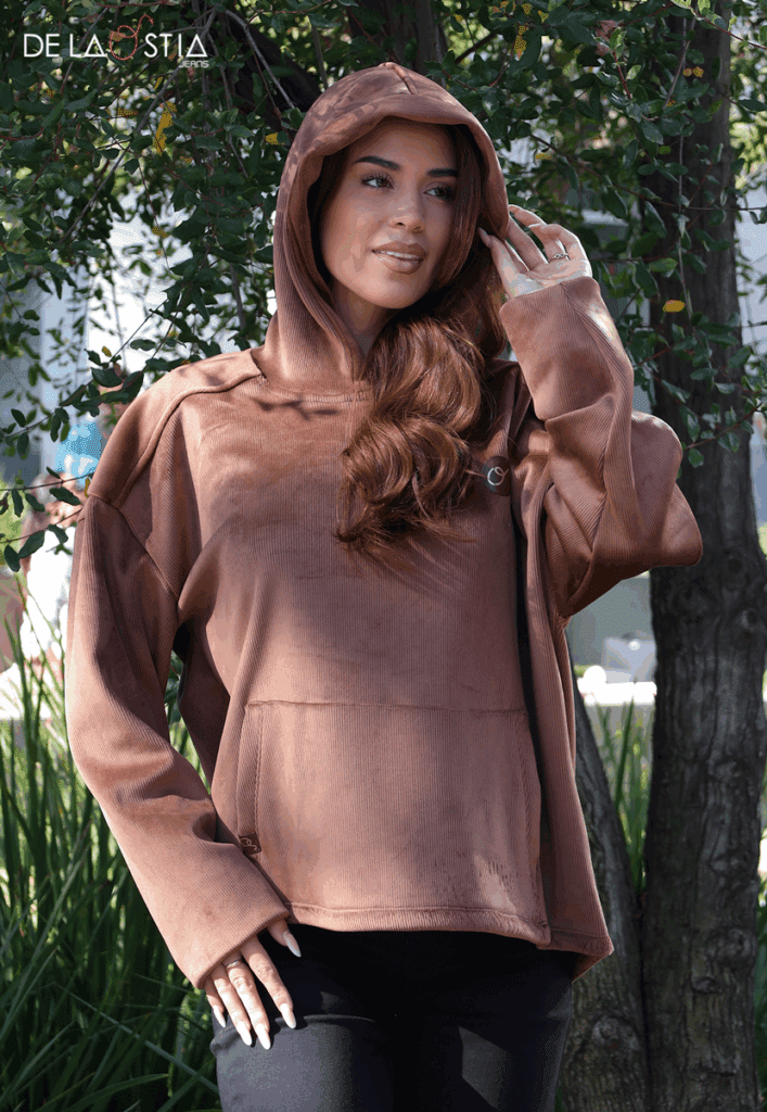 Con un calce oversize relajado, capucha envolvente y bolsillo tipo canguro, esta prenda es perfecta para combinar con tus jeans favoritos o usar como look comfy de impacto. El tono chocolate cálido le da ese toque elegante y versátil que va con todo.