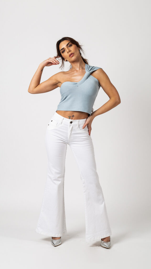 Nuestro Flare Blanco es la prenda estrella que no puede faltar en tu clóset este verano. Un jeans de corte flare (acampanado) con tela elasticada que se ajusta de manera perfecta, realzando tu silueta y entregándote esa fuerza espectacular que solo un buen jeans puede dar.